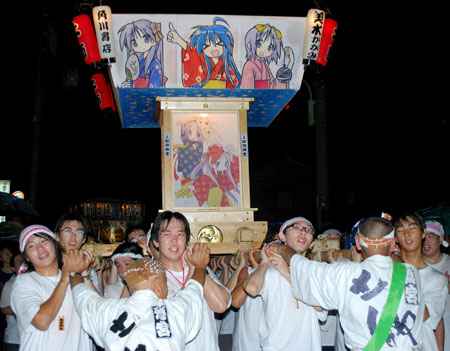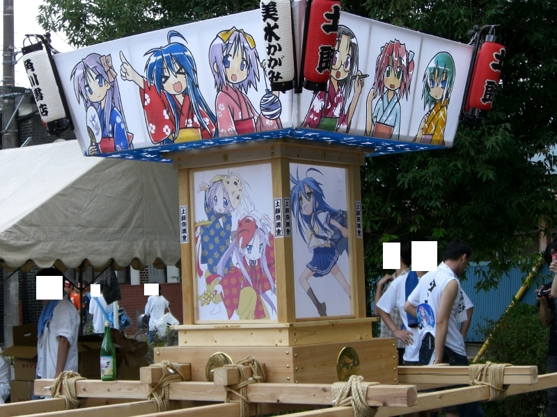 テレビアニメ「らき☆すた」の美少女キャラクターをあしらったみこしが登場。