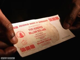 ジンバブエ・ドル札」が登場した。額面は巨額だが、貨幣価値は実質1米ドル(約
