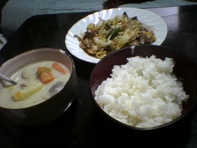 家で大盛りご飯(100円)と即席スープ(20円)を用意する