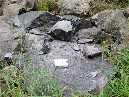 写真中央の欠片や、写真中央上寄りの黒い断面見せている石の周りの岩の断面はどう見ても長年雨風に晒された色しているし。