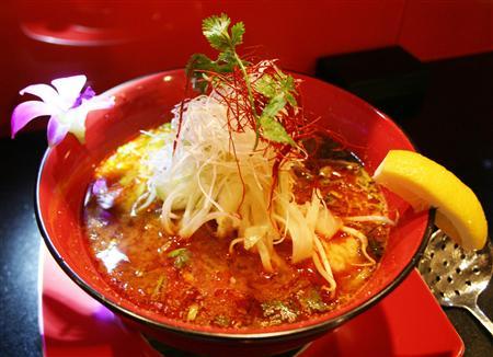 >トムヤンクンをベースに33種類の食材を使った「五味融合美彩麺」。スパイシーで重厚なスープにレモンで味わう。