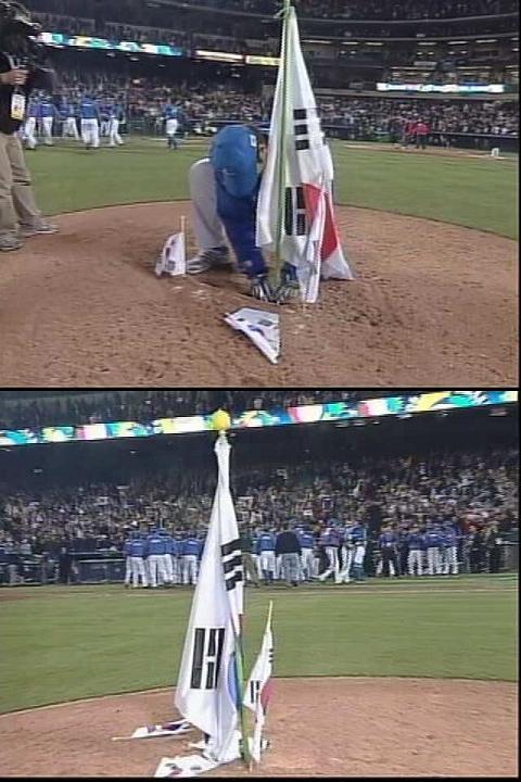 WBC 試合後マウンド上にまた韓国国旗を立てるパフォーマンス