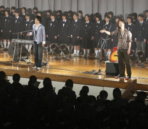 全校生徒約2000人と一緒に壇上で歌うのは、この曲で昨年11月に