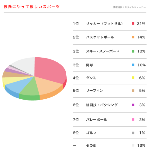 彼氏にやって欲しいスポーツ 1位サッカー、2位バスケ、3位スキー・スノーボード、野球
