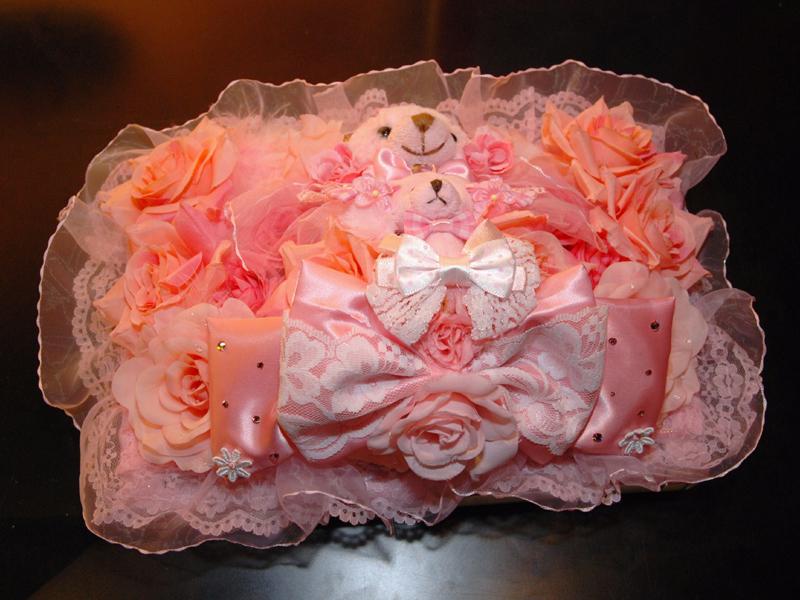 クマをセンターにピンクのリボンとバラをあしらった「かわいいクマちゃんの姫盛りモデル」、
