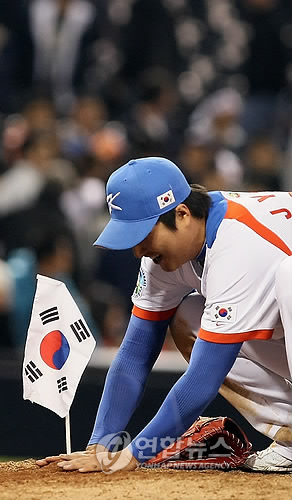 4-2で勝利して4強進出を決めた韓国のイ・ジニョンがマウンドに太極旗を挿している