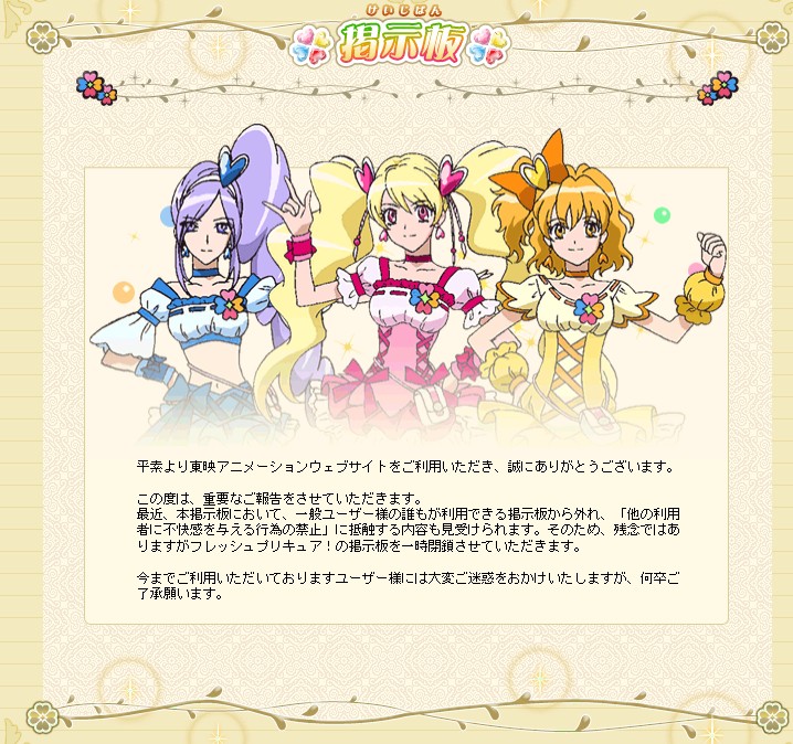 大きなお友達たちが子供向けアニメ「フレッシュプリキュア!」の公式掲示板を閉鎖に追い込む