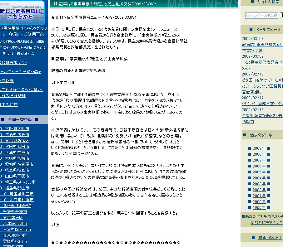 【産経vs民主】小沢氏「拉致問題は金もってって何人かください」発言は事実無根と抗議文をファックス