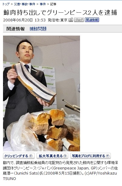 鯨肉持ち出しでグリーンピース2人を逮捕