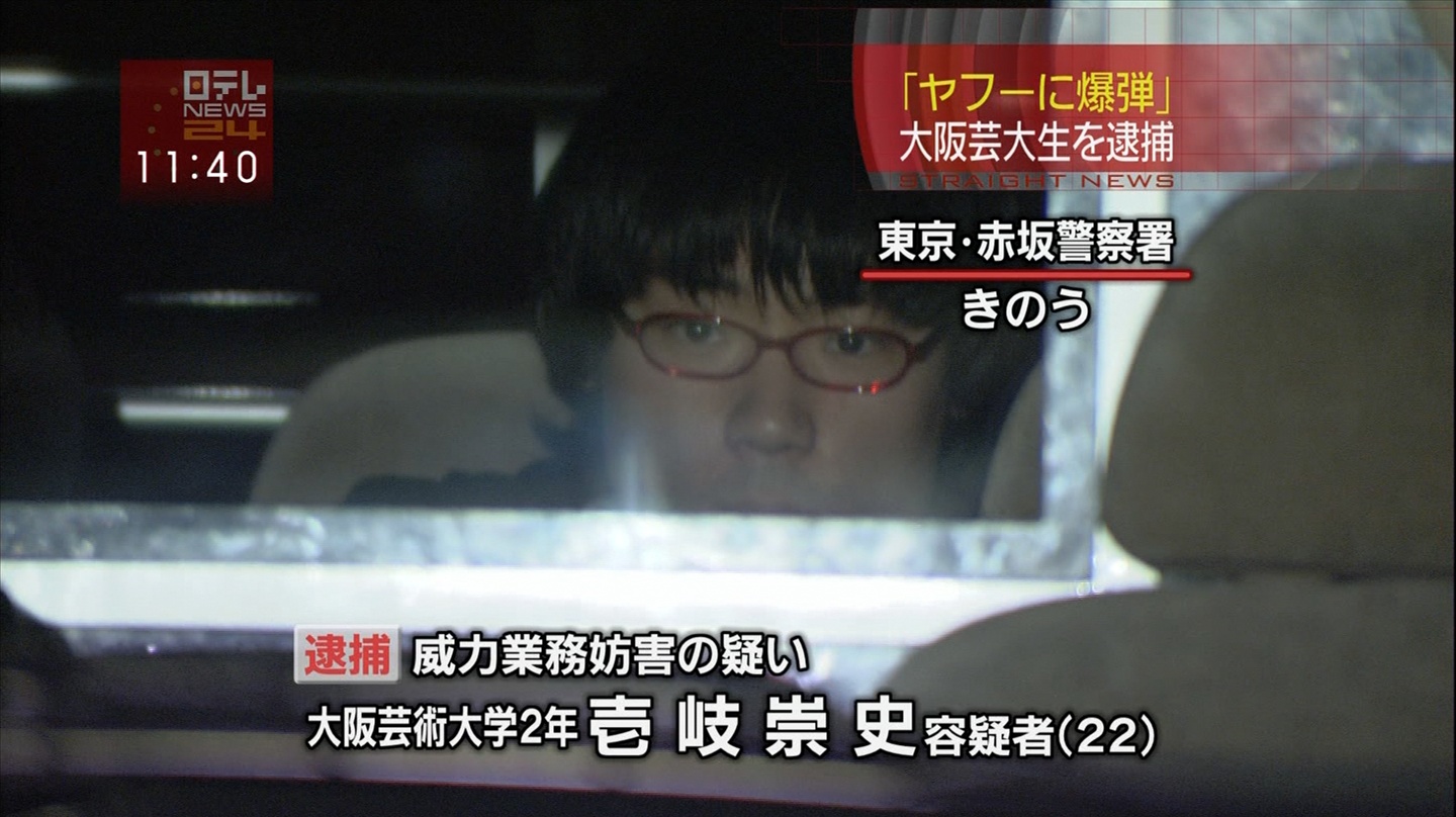 2ちゃんねるに「YAHOOに爆弾を仕掛けた」…大阪芸大芸術学部2年の壱岐崇史容疑者(22)逮捕