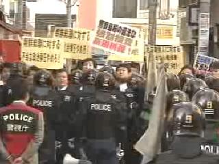 警戒する中、プラカードを手にした総連の活動家ら約50人が集まり、